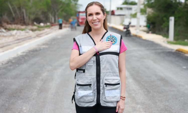 Atenea Gómez Ricalde supervisa pavimentación en la colonia San Valentín en Ciudad Mujeres