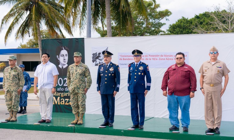 Cozumel, a 4 de marzo de 2026.- El presidente municipal José Luis Chacón Méndez, asistió a la Ceremonia de toma de posesión de Mando y protesta de bandera del comandante de la 188ª zona aérea militar, acto solemne realizado en las instalaciones de la Base Aérea Militar No. 4, donde el comandante de la Cuarta Región Aérea Militar tomó la protesta de ley y dio posesión del mando al ciudadano general de grupo piloto aviador de Estado Mayor, Román Eduardo Ajuria Benavides, como comandante interino de la 18ª zona aérea militar.