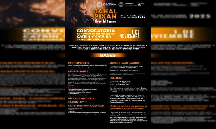 Playa del Carmen, Quintana Roo, 22 de octubre de 2025.- El Instituto Municipal de la Cultura y las Artes de Playa del Carmen invitó a las familias playenses a participar en los diversos concursos que se llevarán a cabo en el marco de las festividades del Janal Pixan 2025, con una bolsa en premios de casi 200 mil pesos.