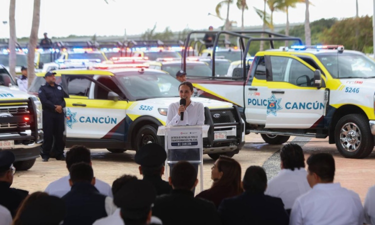 Cancún, Q. R., a 03 de febrero de 2026.- “Este día es histórico para nuestro municipio y muy importante porque seguimos trabajando en nuestra estrategia integral de construcción de paz, no solamente con discursos y con palabras, sino con acciones reales y contundentes; es la máxima prioridad de nuestro gobierno, es la principal exigencia de las y los cancunenses”, afirmó la Presidenta Municipal, Ana Paty Peralta, al entregar con la gobernadora Mara Lezama, 70 nuevas unidades para la Secretaría Municipal de Seguridad Ciudadana y Tránsito, sumando más de 200 patrullas al parque vehicular.