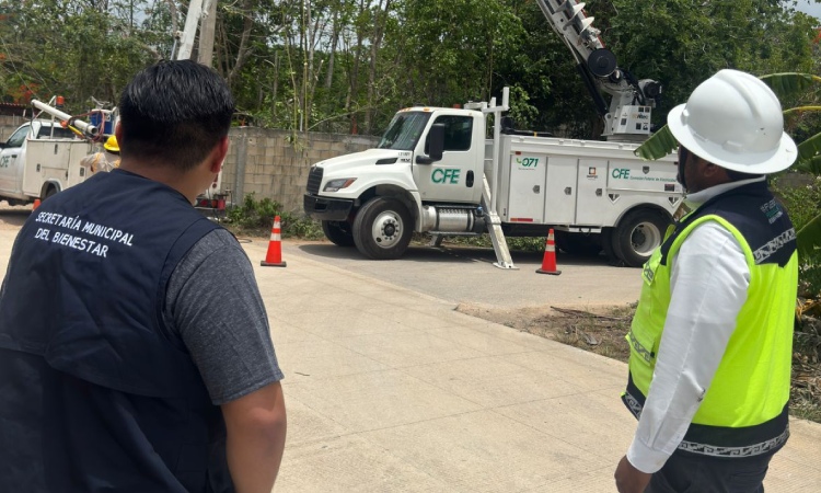 Leona Vicario, Puerto Morelos, Quintana Roo, 31 de agosto de 2025.—El gobierno de Puerto Morelos mantiene trabajos coordinados con la Comisión Federal de Electricidad (CFE) para impulsar el desarrollo de esta Delegación y llevar bienestar a la población con la renovación de sus cables de distribución de energía y la habilitación de un nuevo ramal para ampliar el área que recibe el servicio.