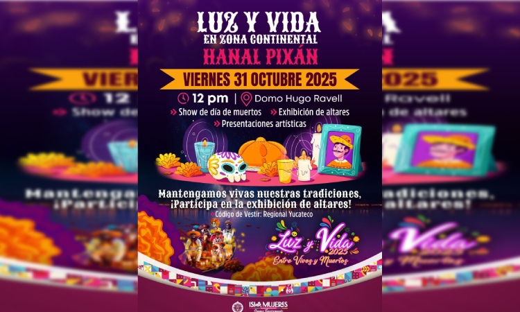 Isla Mujeres, Quintana Roo, 28 de octubre de 2025.- El Gobierno de Isla Mujeres, encabezado por la Presidenta Municipal, Atenea Gómez Ricalde, invita a todas las familias y visitantes a participar en el Festival “Luz y Vida, entre Vivos y Muertos”, este viernes 31 de octubre a las 12:00 horas en el Domo “Hugo Ravell”, en la Zona Continental.