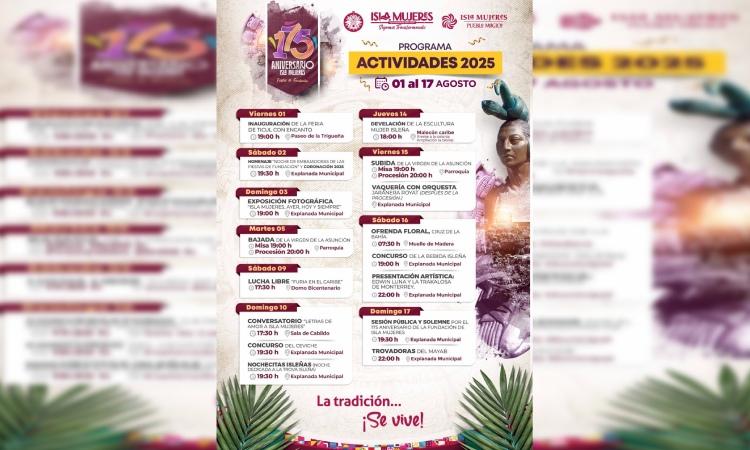 Isla Mujeres, Quintana Roo a 10 de agosto de 2025.- El Gobierno de Isla Mujeres, que encabeza la Presidenta Municipal, Atenea Gómez Ricalde, invita a las familias isleñas y a todos los visitantes a sumarse a las actividades de cierre de las Fiestas de Fundación 2025.