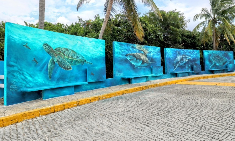 La Presidenta de Isla Mujeres, destacó que el Ayuntamiento se sumó con los murales del Tiburón Ballena y la Tortuga Marina, obras del artista Emmanuel Sánchez, que además de mejorar la imagen urbana de esta avenida principal, promueven un mensaje de sustentabilidad y cuidado de estas especies emblemáticas.