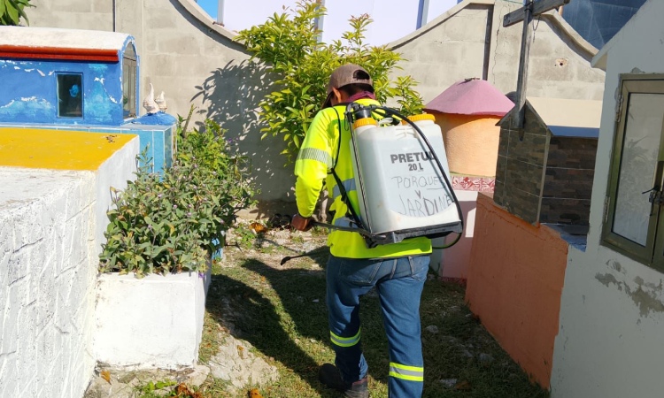 La Directora de Gobierno, Dube Delgado Moguel, informó que, personal de la dependencia a su cargo, con apoyo de las cuadrillas de Parques y Jardines, esán realizando limpieza general, retiro de escombro, poda y chapeo, con la finalidad de que luzcan limpios, bonitos y ordenados en la celebración de Día de Muertos.