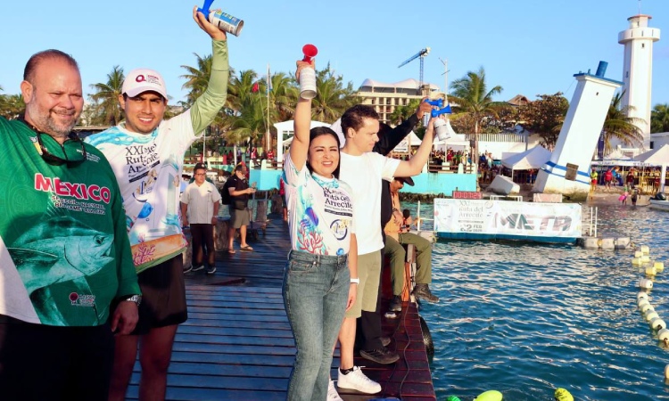 La Presidenta Municipal Blanca Merari Tziu Muñoz dio los pitazos de salida a 960 competidores nacionales e internacionales, en esta XXI Edición del Maratón de Aguas Abiertas Ruta del Arrecife, que se registraron en las diferentes categorías.