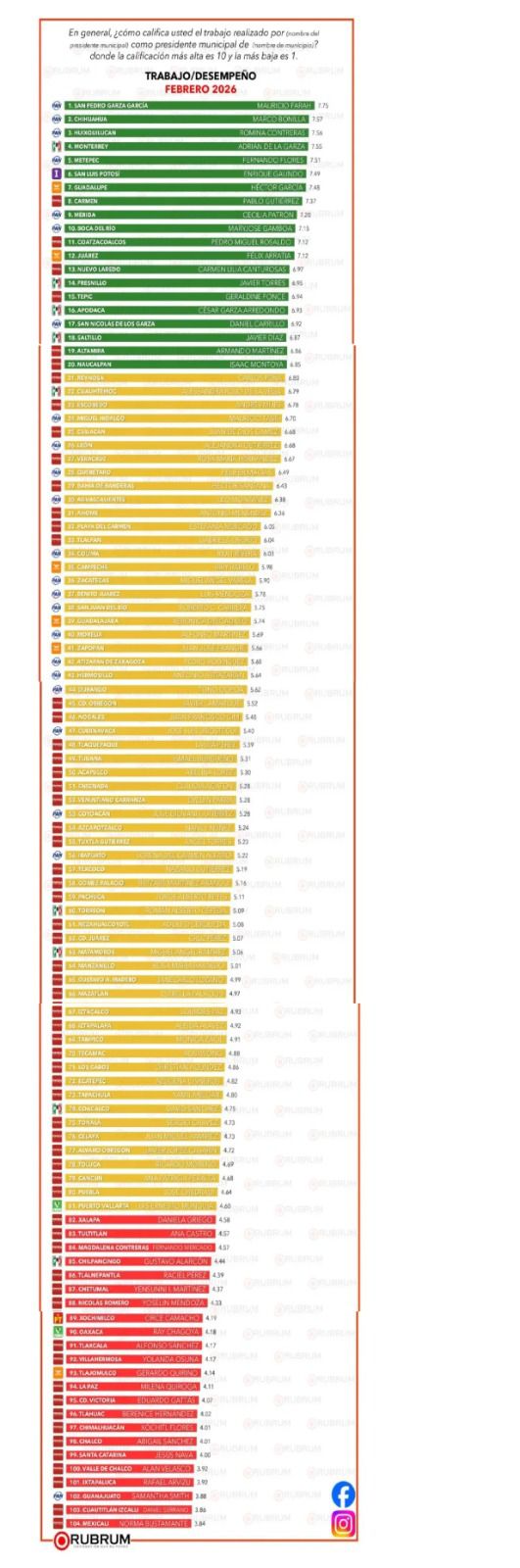 Ciudad de México.- La empresa Rubrum, con amplia experiencia en materia política-electoral, publicidad y comunicaciones, presentó hoy las nuevas calificaciones que dieron los ciudadanos al desempeño de los alcaldes en 104 municipios de todo México, donde están incluidos las alcaldesas de Othón P. Blanco, Yensunni Idlia Martínez Hernández; Playa del Carmen, Angy Estefanía Mercado Asencio y; la de Benito Juárez, Ana Patricia Peralta de la Peña.